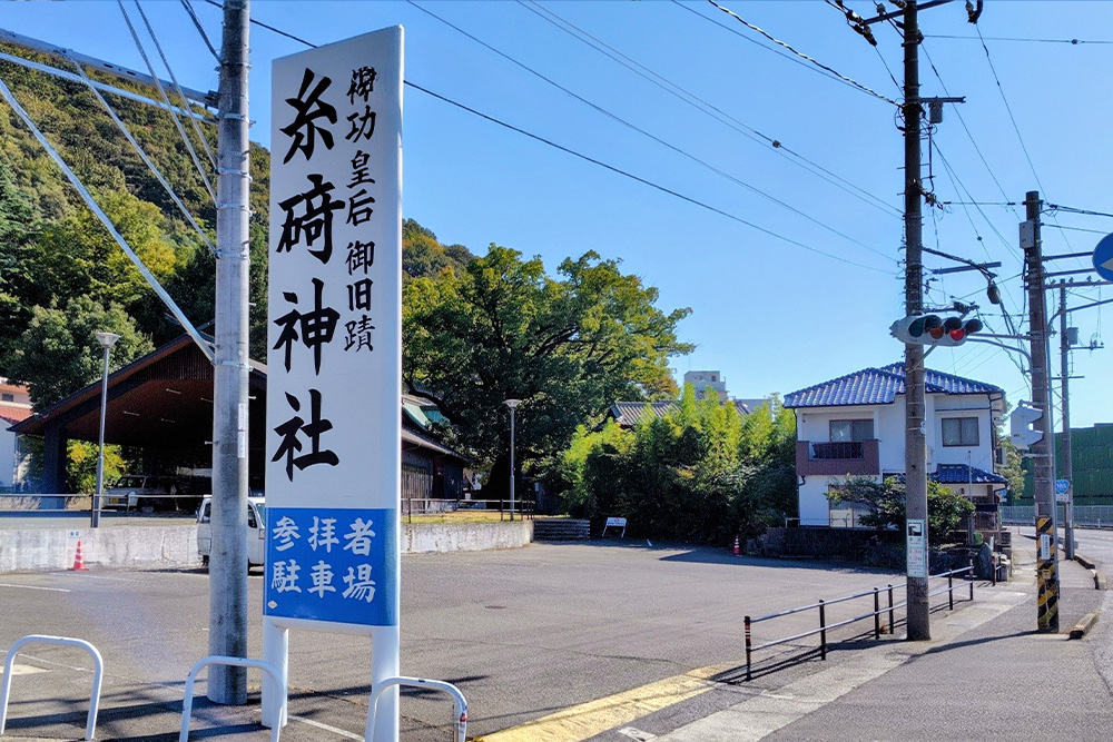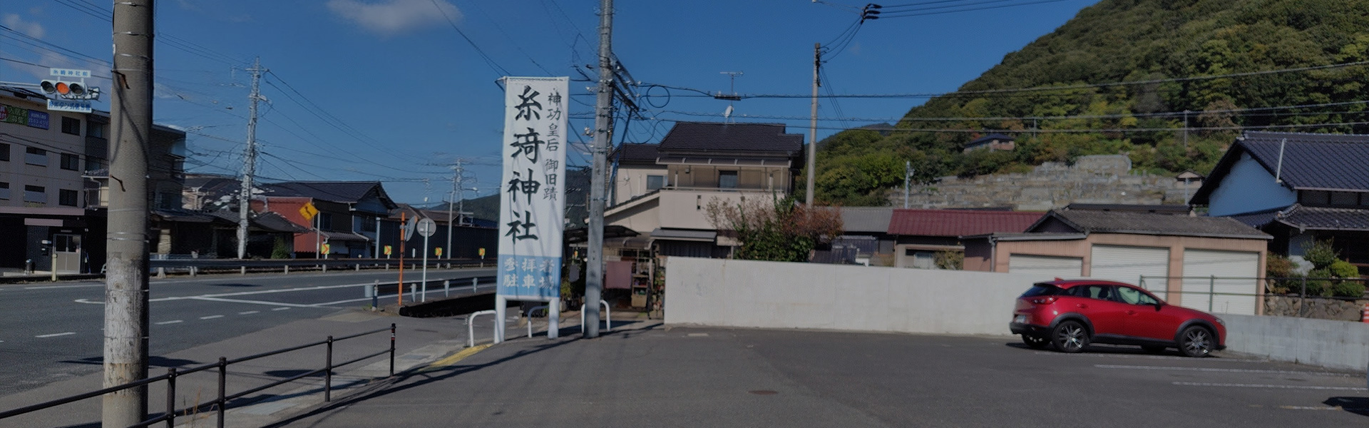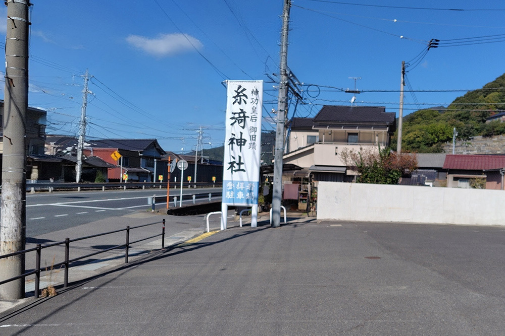 緩い下りを終える手前左側に見える「神功皇后御旧跡糸𥔎神社 参拝者駐車場」看板と点滅式信号機の脇の入口を左折し、駐車場へお入りください。
