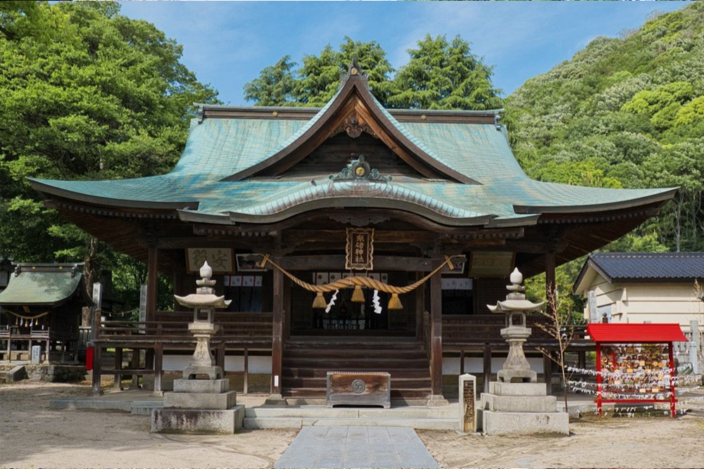 拝殿は入母屋造平入の銅板葺、桁行・梁間とも3間の構造です。正面には千鳥破風と軒唐破風付きの向拝(こうはい)が設けられています。万治2年(1659)に建立されました。