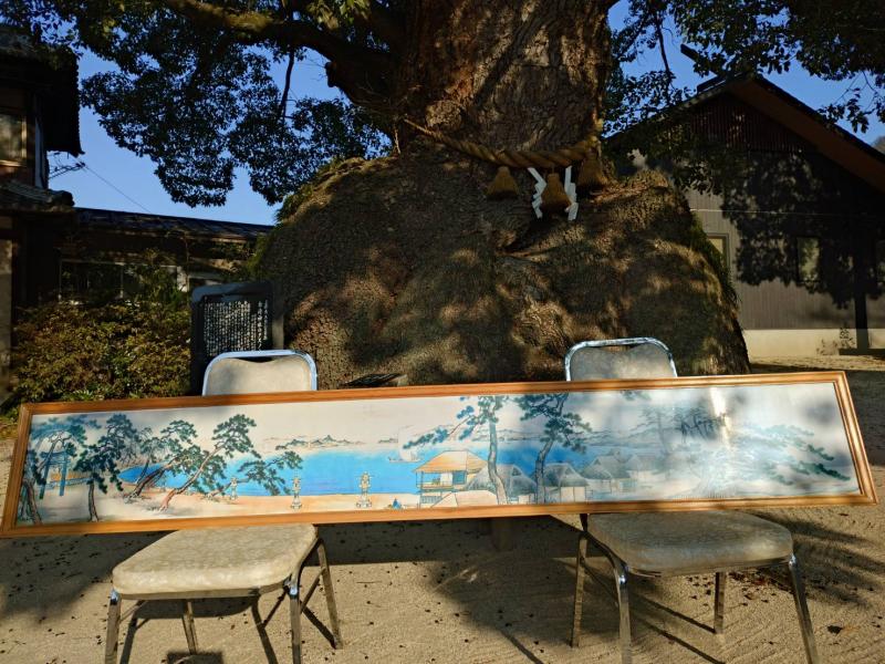 そこで参加者の皆様に、昔々の糸崎の様子を想像して現在の姿と重ね合わせたりする中で、景色をより楽しんで頂こうと、江戸末期頃 (1858) に描かれた糸碕神社門前の絵図を出発前にご覧頂きました。(画像3枚目)
